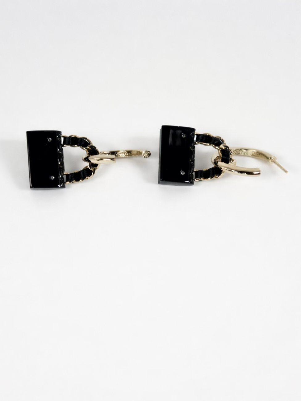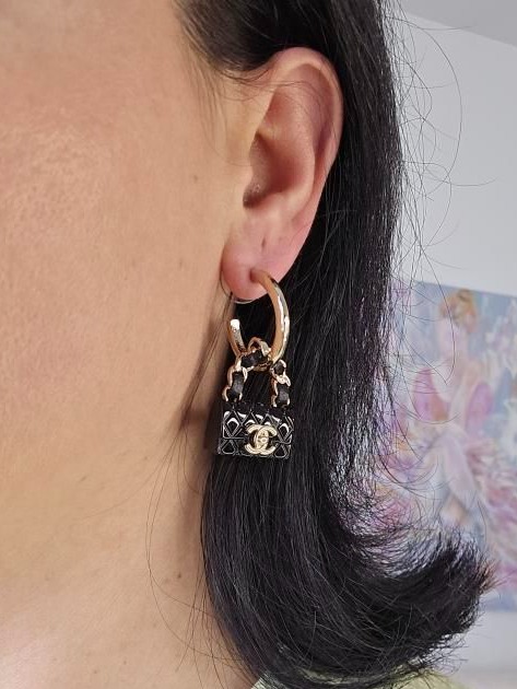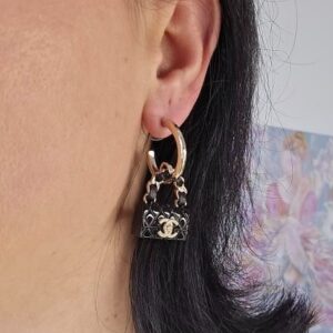 Chanel black enamel handbag earrings with turnlock design closures. 1.75″