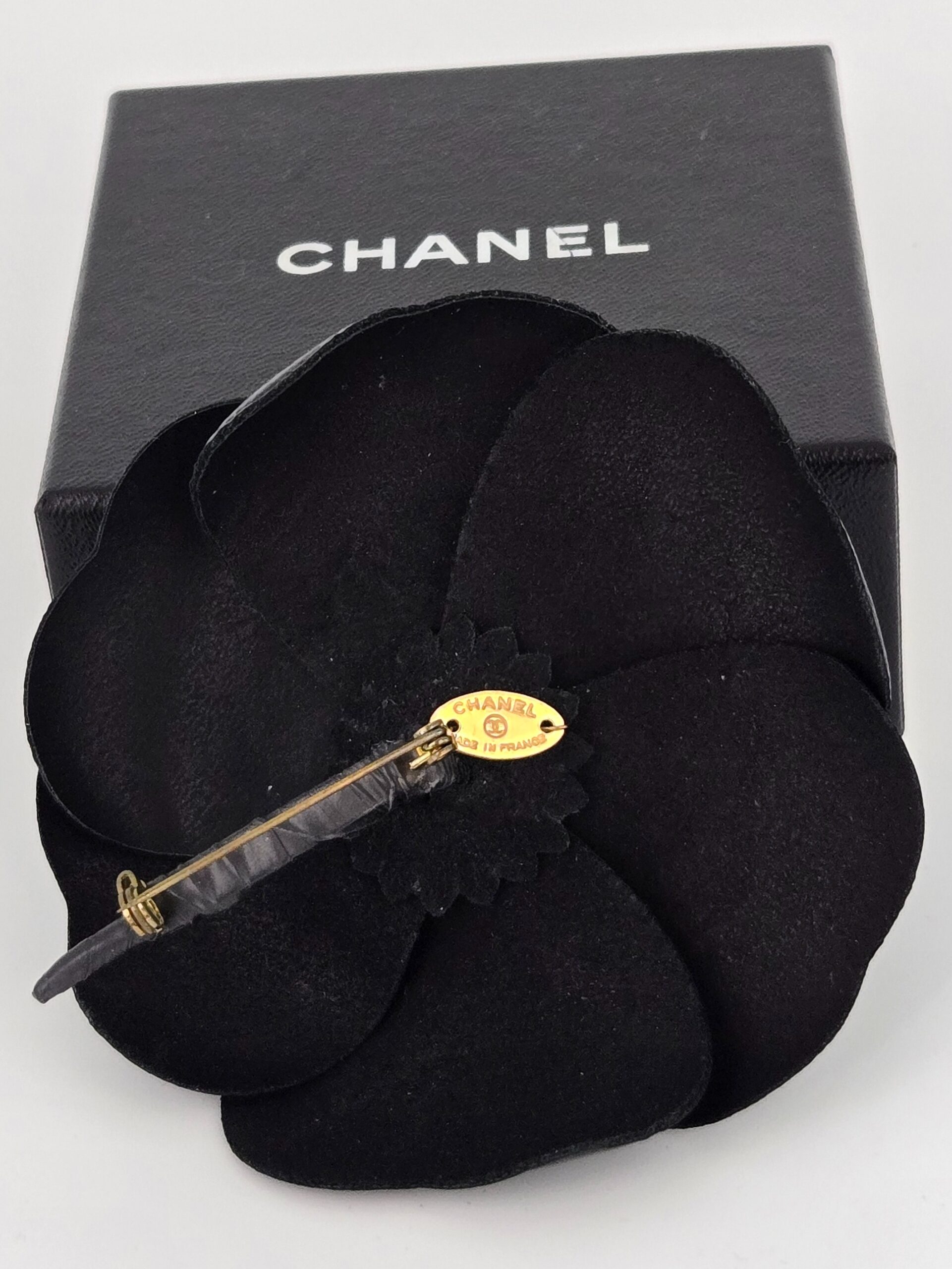 Black leather camelia brooch 3.5×3″