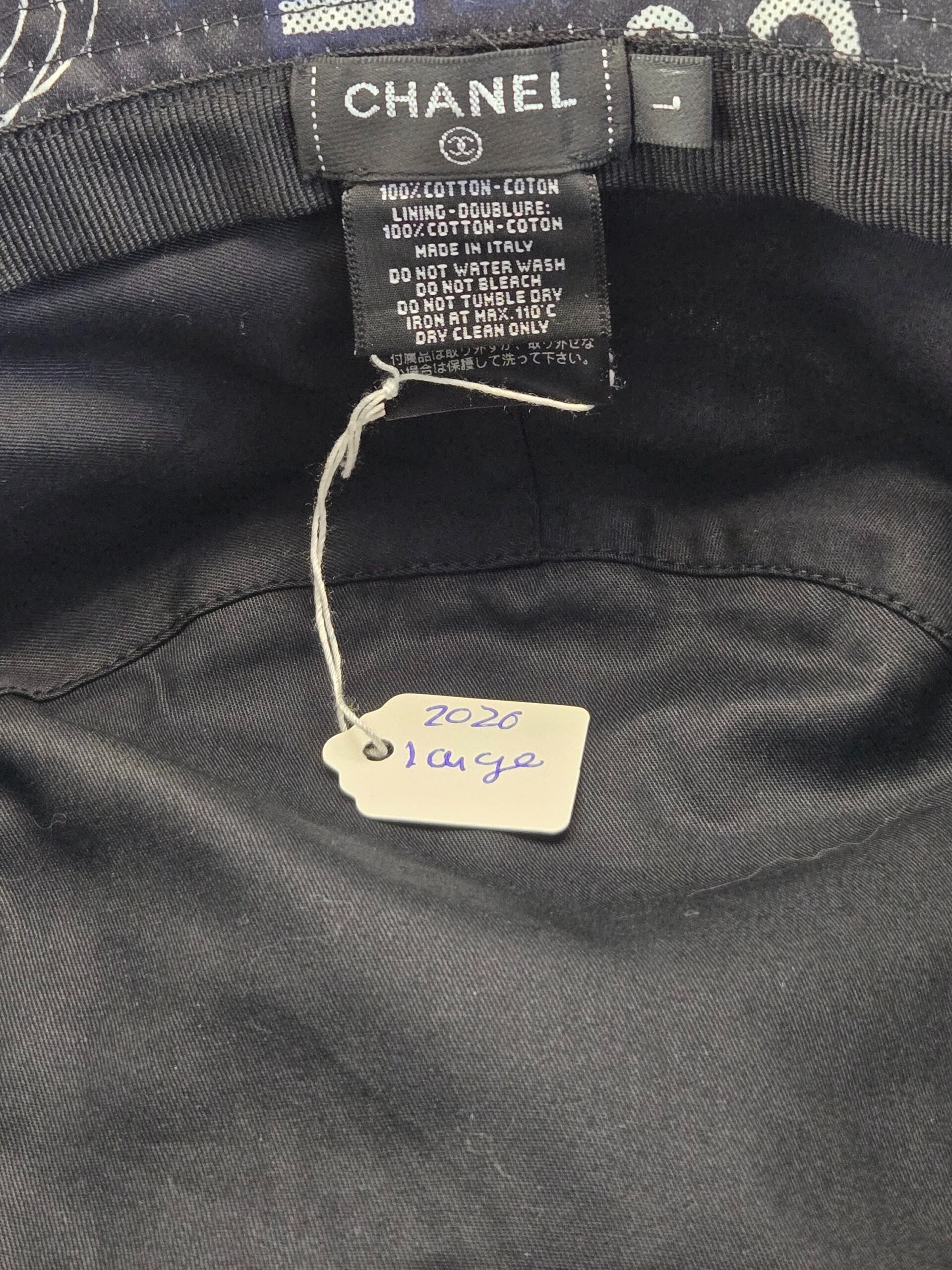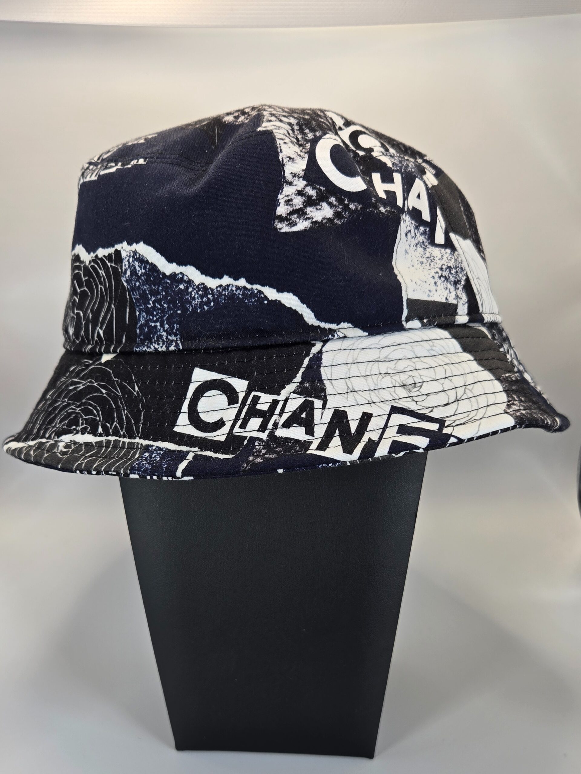 Chanel Bucket Hat, Blue and Black, Size L, Chanel Cambon, Cotton Coco Bucket Hat with white print.
