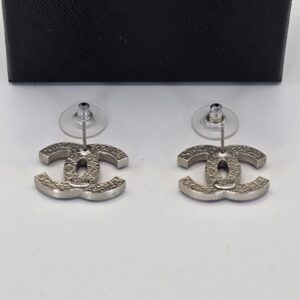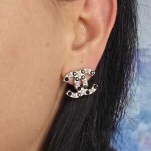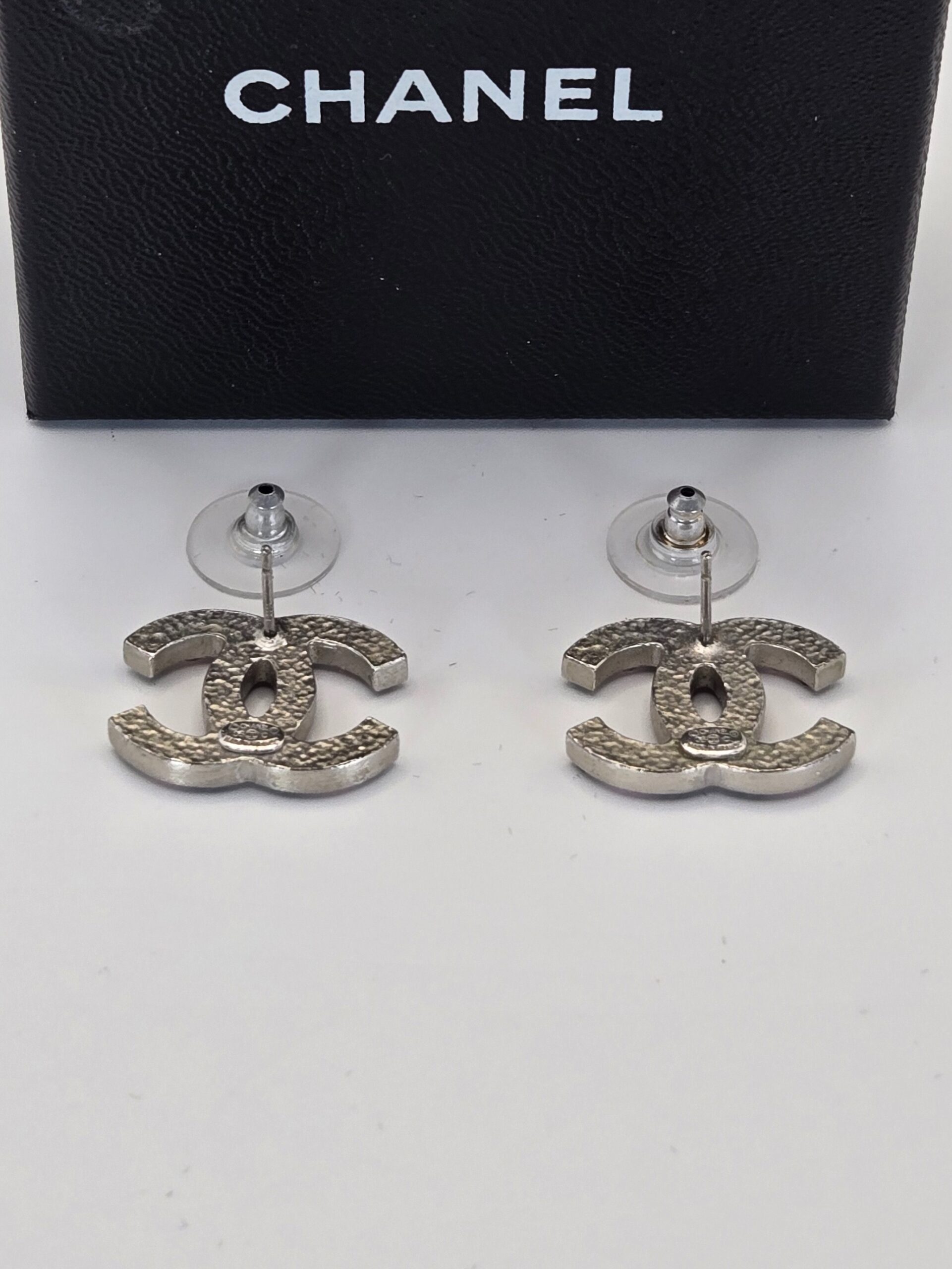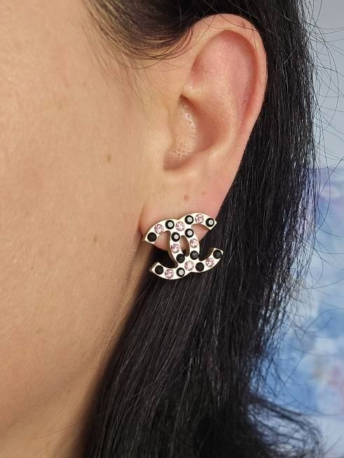 Chanel CC Black and Pink pierced earrings, silver hardware .75″