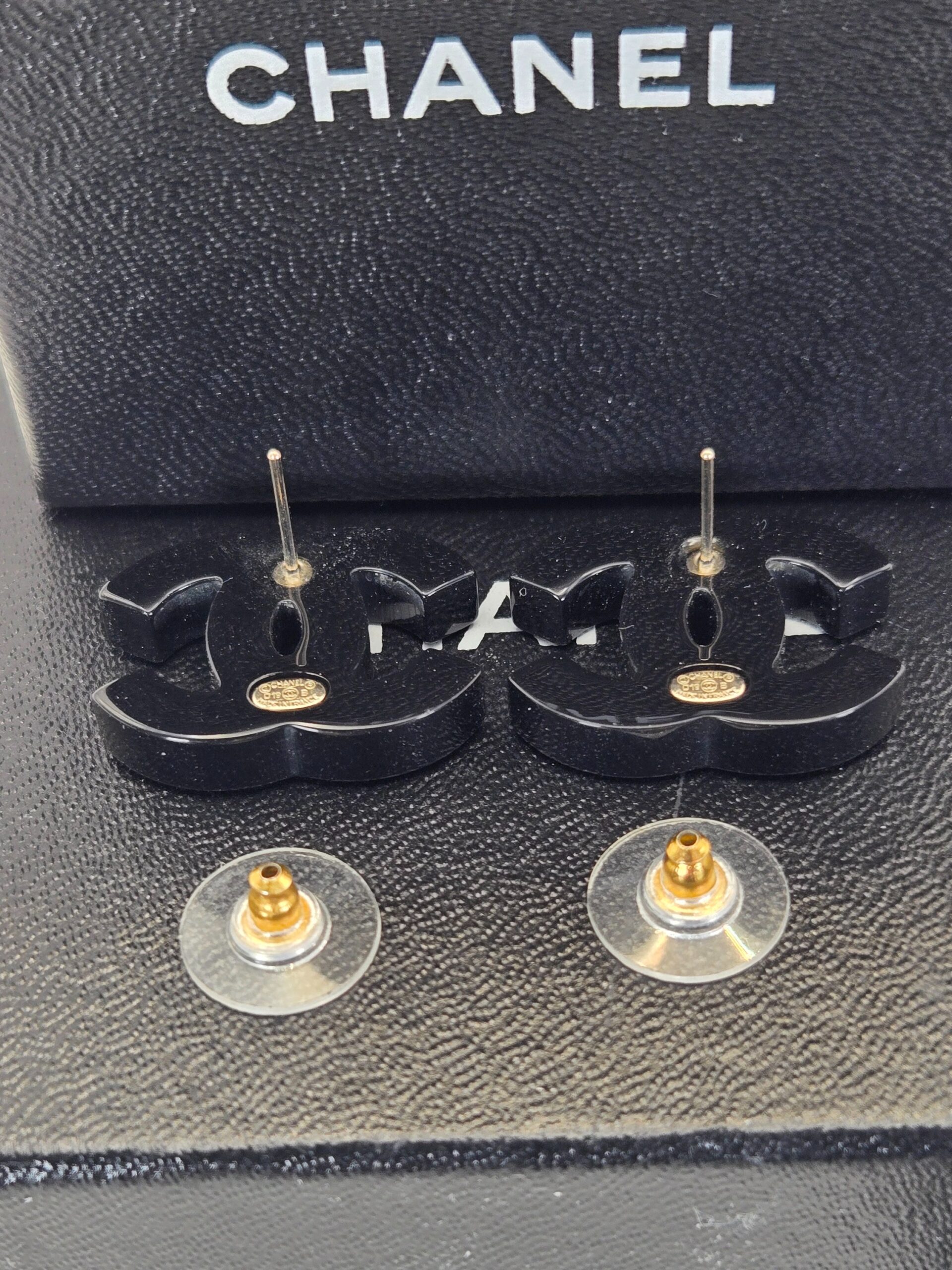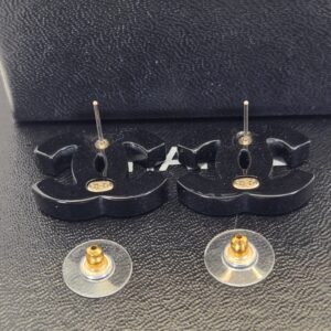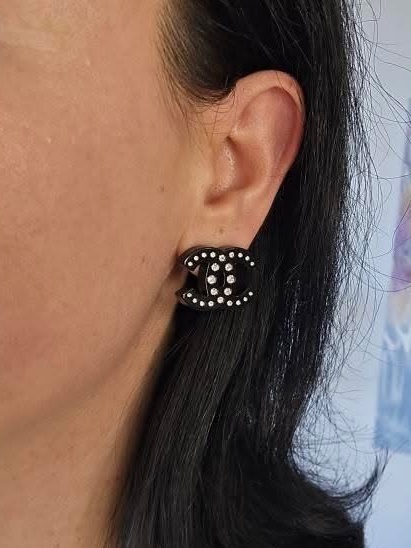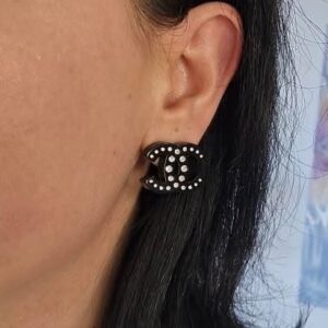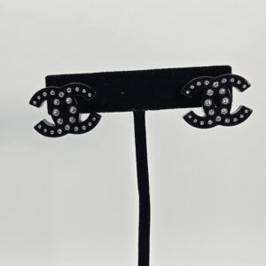 Chanel black resin crystal CC pierced earrings 1″