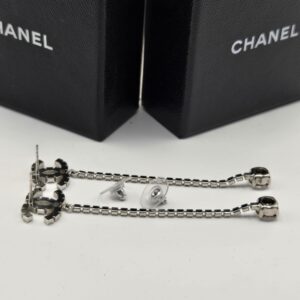 Chanel B18S dangling CC earrings featuring a classic interlocking CC logo stud with a long, elegant crystal drop. The design showcases a refined line of rhinestones ending in a faceted crystal, creating beautiful movement and sparkle.