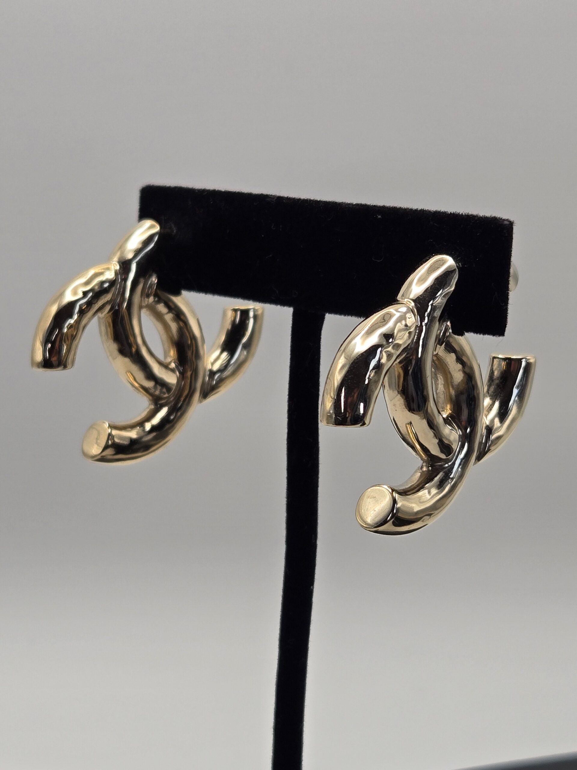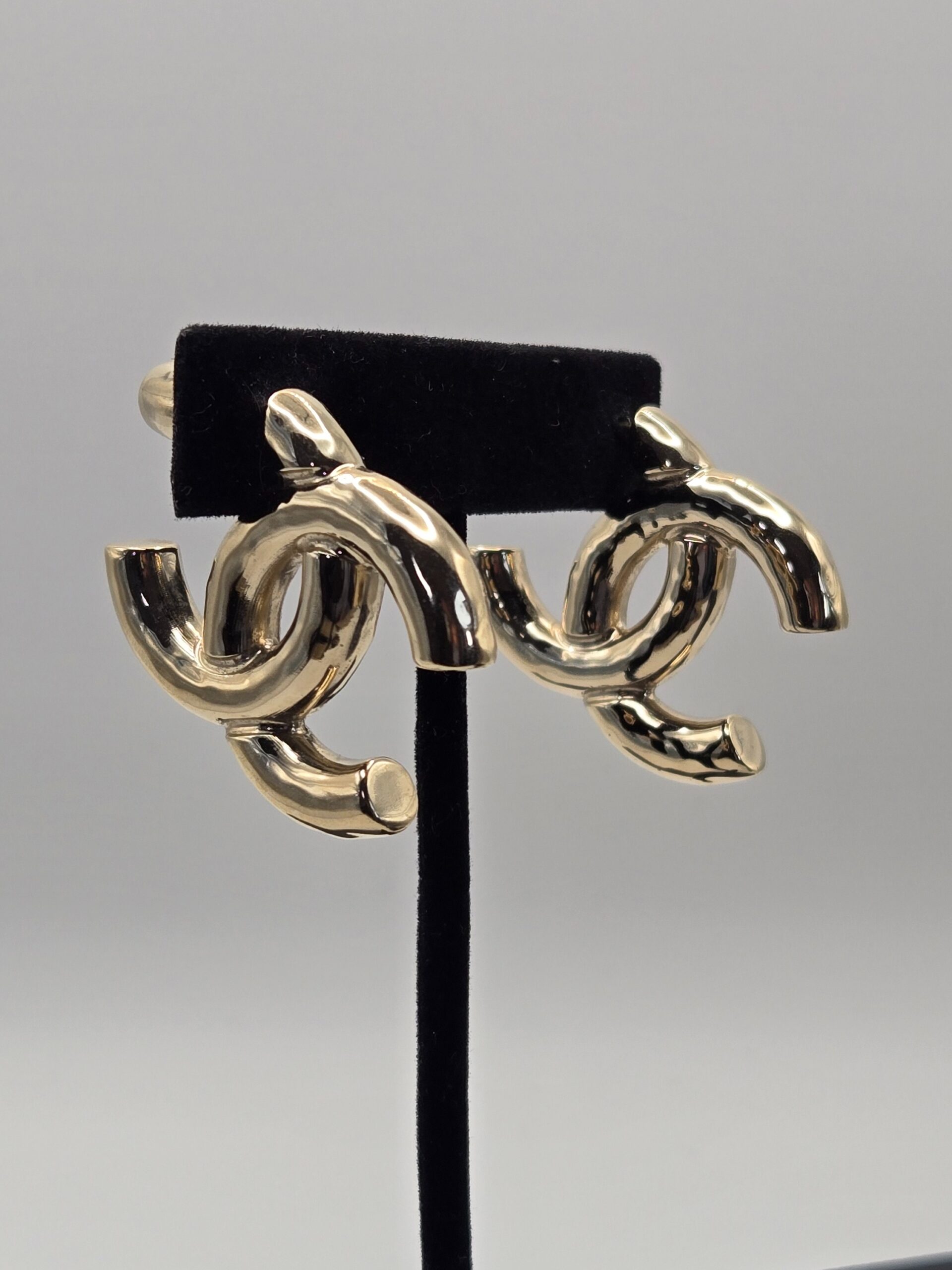 Chanel large gold CC pierced earrings. These beauties sit on the bias and are quite lightweight. B22C 1.5″