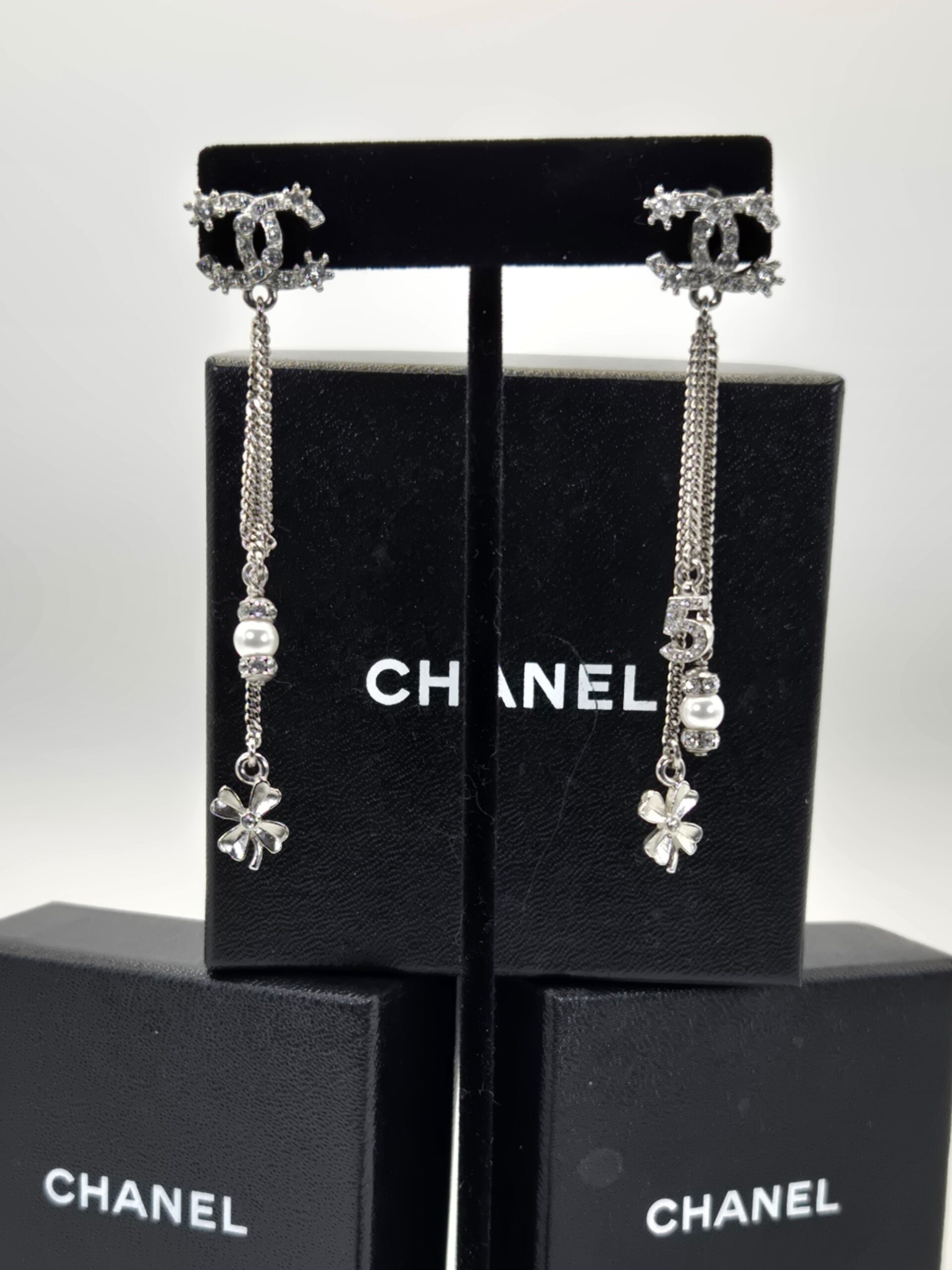 Chanel silver dangle 5, clover and pearl earrings 3″