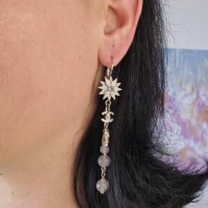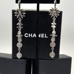 Chanel 15A star dangling earrings featuring a sparkling star motif at the top, followed by a cascading line of crystals and pearl bead drops. This elegant and elongated design combines celestial inspiration with Chanel’s signature use of refined materials.