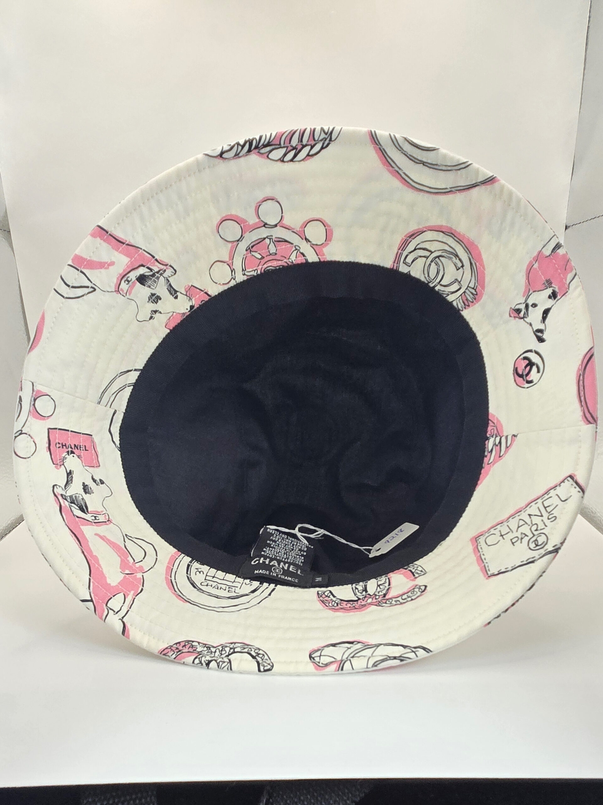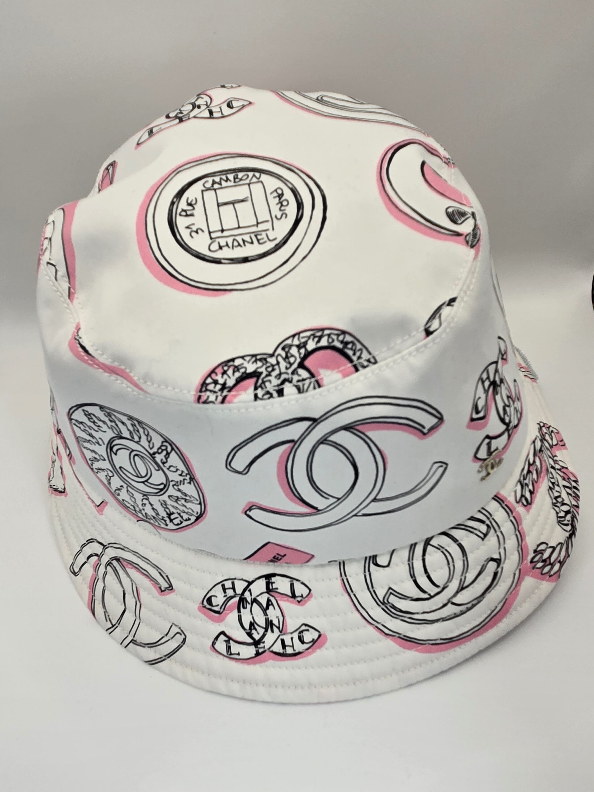 Chanel white with black and pink bucket hat. Design is unique – CC vintage brooches and dogs, Size M Year 23P