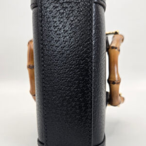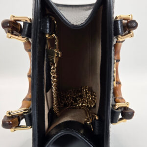 Gucci Diana Super Mini Bag in Black Grained Leather with Gold-Tone and Bamboo Hardware. Bamboo Top Handles and Removable Gold-Tone Chain Strap 4.75″ W x 5″ H x 2.25″ D. Handle 1.25, strap 22″